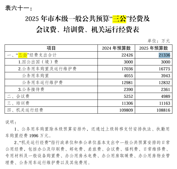 《2025 年南京市政府预算草案说明》关于三公经费的表格,其中写着2025年预算数为21336万元。
