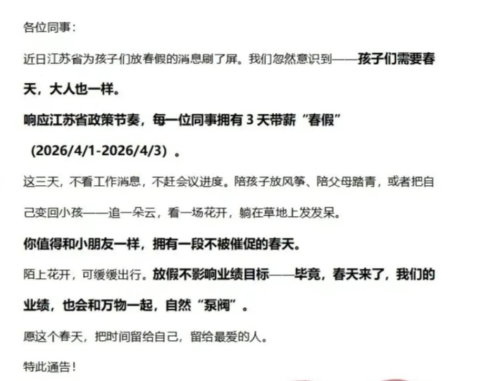 放三天带薪春假的通知引发网友关注