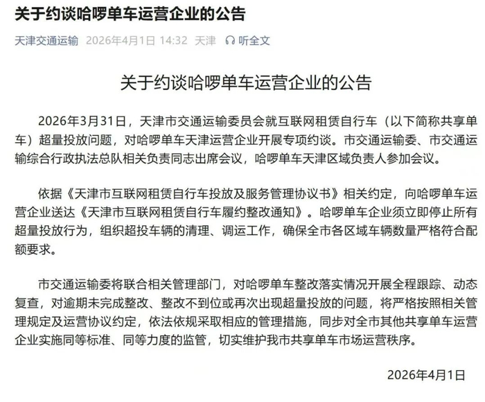 4月1日,天津市交通运输委员会通过其微信公众号“天津交通运输”发布了“关于约谈哈啰单车运营企业的公告”,具体内容如下。