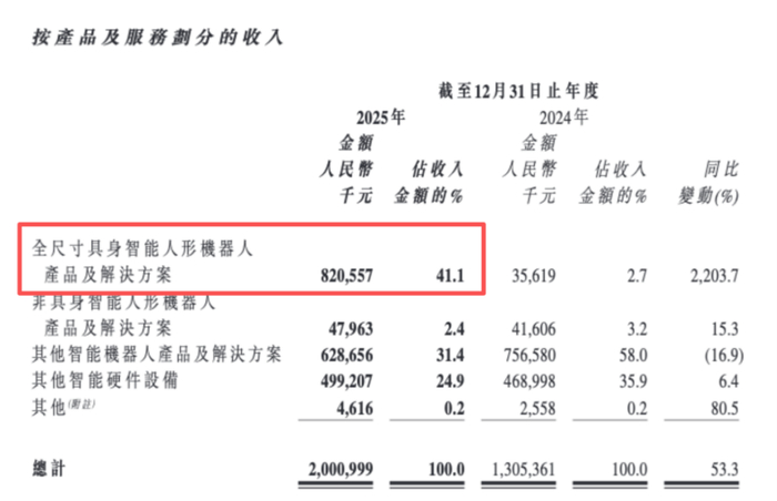 更值得关注的是,这项业务不仅增速迅猛,更是已经成为公司收入结构中的核心支柱。2025年,全尺寸具身智能人形机器人收入占比达到41.1%,超过其他智能机器人产品及解决方案、智能硬件设备等传统板块,首次站上“C位”。