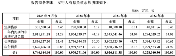 截至2025年三季度末,公司的有息负债高达874.61亿元。其中,一年内到期的有息负债合计321.34亿元。除此之外,还有159.39亿元的应付账款。