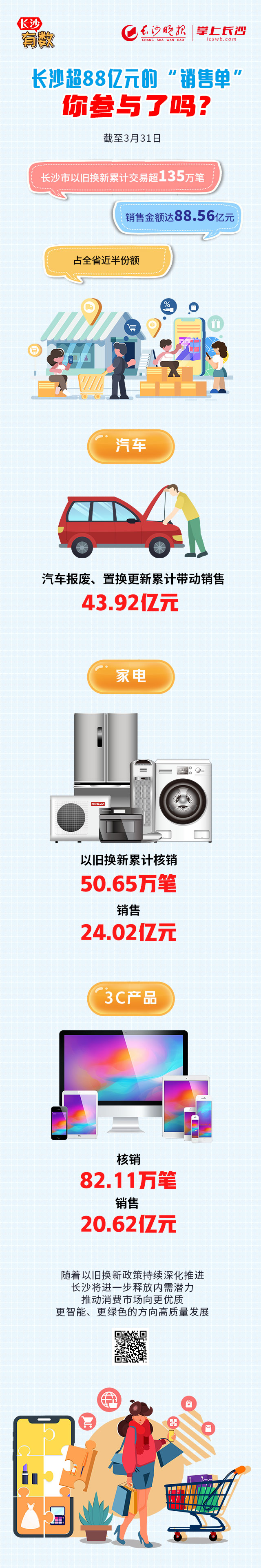 长沙超88亿元的“销售单”,你参与了吗?|长沙有数 长沙晚报 《长沙晚报》官方账号 04.0122:34 关注 火热开局!长沙“以旧换新”激活一季度消费市场,一组数据带你看看“销售成绩单”→ 作者:刘天乐 赖立编辑:罗敏