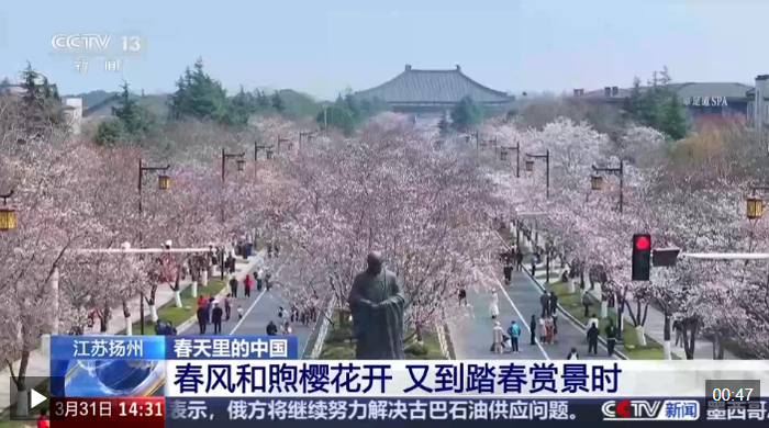 根据花期,今年扬州的樱花季从3月26日一直持续至4月3日,其间,当地还推出各种赏花活动,包括樱花打卡墙、樱花市集等,大家购买樱花文创产品,品尝樱花美食,留下春天的美好记忆。