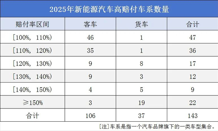 赔付率超过100%(尚未考虑财险公司日常经营管理费用成本)的高赔付车系有143个,较上年增加6个,其中客车106个、货车37个。