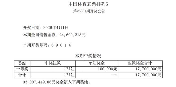 排列5第2026081期中出177注,奖池累计3300万元