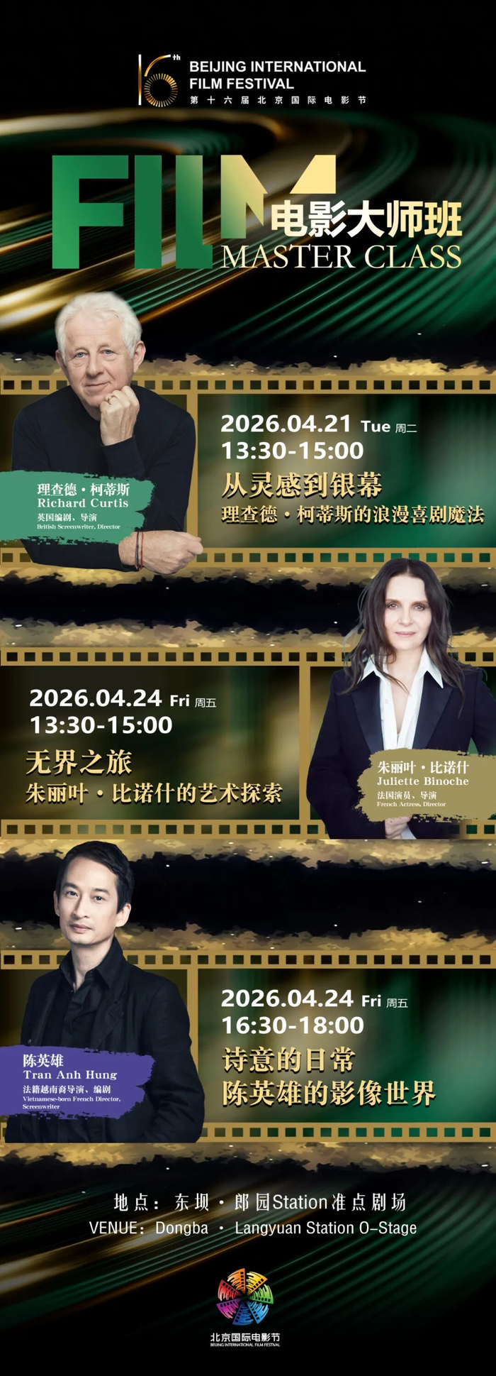 本届电影大师班,特别邀请到了法国演员、导演朱丽叶·比诺什,法籍越南裔导演、编剧陈英雄,以及英国导演、编剧理查德·柯蒂斯三位在国际上具有重要地位的嘉宾,分享他们的从业历程与艺术见解。