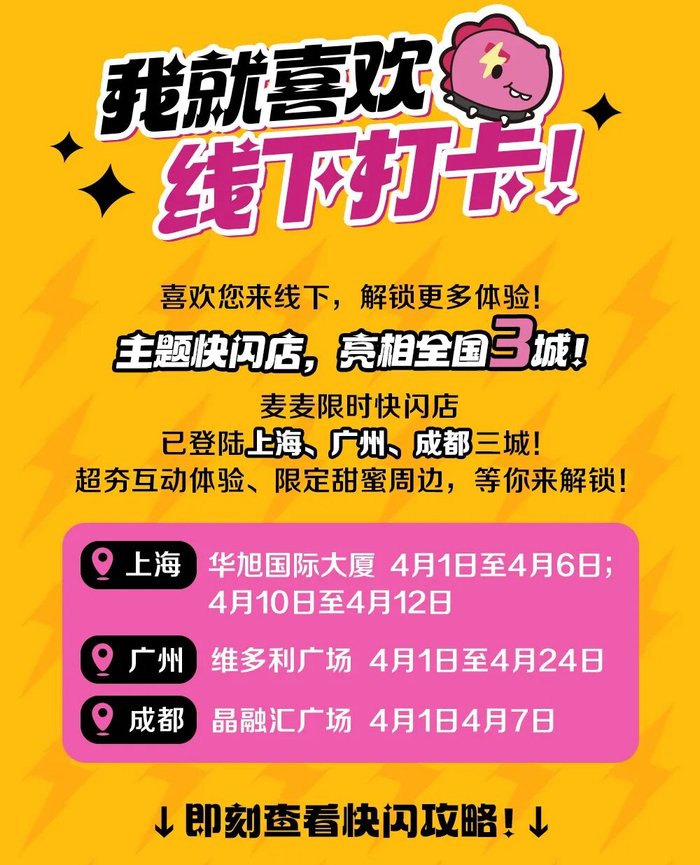 *活动期间,指定城市「麦麦泷情蜜意甜品站」快闪店共设五大区域:「泷情蜜意甜品站巴士总站」「一笑倾城照相馆」「十万伏特练歌房」「有点甜工作室」「全城热恋CBD」。其中,「一笑倾城照相馆」「十万伏特练歌房」「有点甜工作室」为互动体验区,须凭当日指定产品的消费小票至互动区核验,每张小票在每个互动区域仅限参与1次。现场互动礼品为非卖品(指定周边除外)。