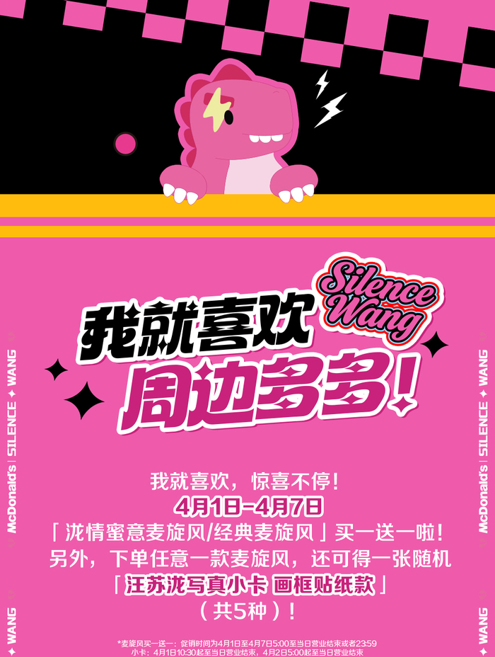 活动期间,每购买一份“泷情蜜意麦旋风买一送一套餐,即可获赠汪苏泷限定小卡1张(共5款,款式随机发放,规格:54*85mm,该尺寸不含包装袋;材质:纸类)。2026年4月1日至4月7日期间的小卡活动:全国各渠道共40万张,参与活动单店最低供应量为50张,赠完即止,具体以门店实际库存为准。仅限部分门店参与,详情请见店内海报或活动页。如有疑问,欢迎咨询店内工作人员。