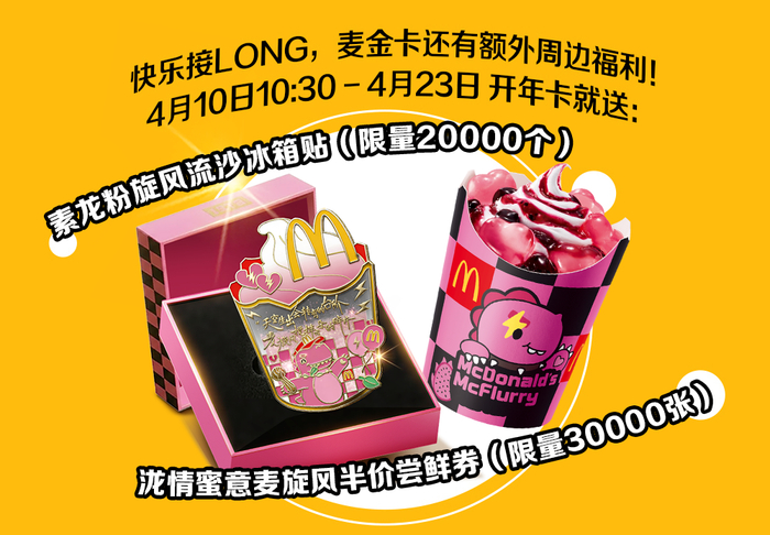 2026年4月10日10:30至4月23日23:59在麦当劳App/小程序开麦金年卡可得素龙粉旋风流沙冰箱贴1份,共限量2万份;泷情蜜意麦旋风半价尝鲜券1张,共限量3万份,规则见活动页。赠品及包装以实物为准,图片仅供参考。麦金卡权益见购买须知。