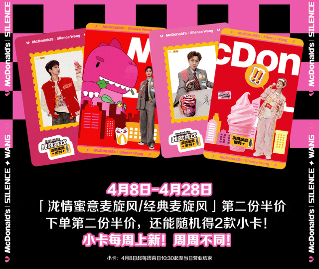 活动期间,每购买一份“泷情蜜意麦旋风”,即可获赠汪苏泷限定小卡1张(共5款,款式随机发放,规格:54*85mm,该尺寸不含包装袋;材质:纸类)。2026年4月8日至4月28日期间的小卡活动:全国各渠道每周最低供应量共40万张,参与活动单店每周最低供应量为50张,赠完即止,具体以门店实际库存为准。仅限部分门店参与,详情请见店内海报或活动页。如有疑问,欢迎咨询店内工作人员。
