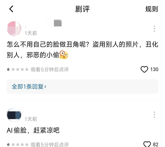 从剧评来看,该短剧剧情和AI制作技术确实大受欢迎,但评论区众多网友也纷纷谴责制作方盗用他人人脸的行为,有网友甚至用“AI偷脸,赶紧凉吧”表达愤怒。