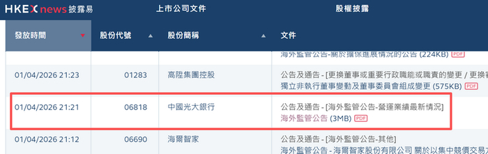 港交所信息显示,4月1日晚间21:08、21:21,光大银行先后发布两份公告,对在港交所披露的2025年年报(H股)中的分支机构资产规模数据进行了修订,同时挂出一份新的A股年报。至此,该行在上交所和港交所最新挂出的4份年报数据实现一致。