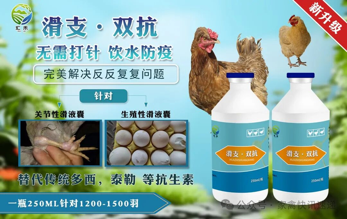 汇禾生物研发团队在多年药物以及研发道路上不断摸索、不断创新。历时多年终于研发出了可以代替我们滑液囊疫苗打针饮水使用的(滑支双抗)一瓶可针对1500只鸡,保护期长达45天。不用打针!不用投药!全程免疫滑液囊,仅需使用一天,不需要天天用药。饮水使用,有效预防滑囊问题。24小时提高滑液囊MS抗体系数、超长保护期。真正做到滑液囊疫苗全程不打针无应急,抵抗鸡群滑液囊问题。为我们养鸡道路保驾护航!