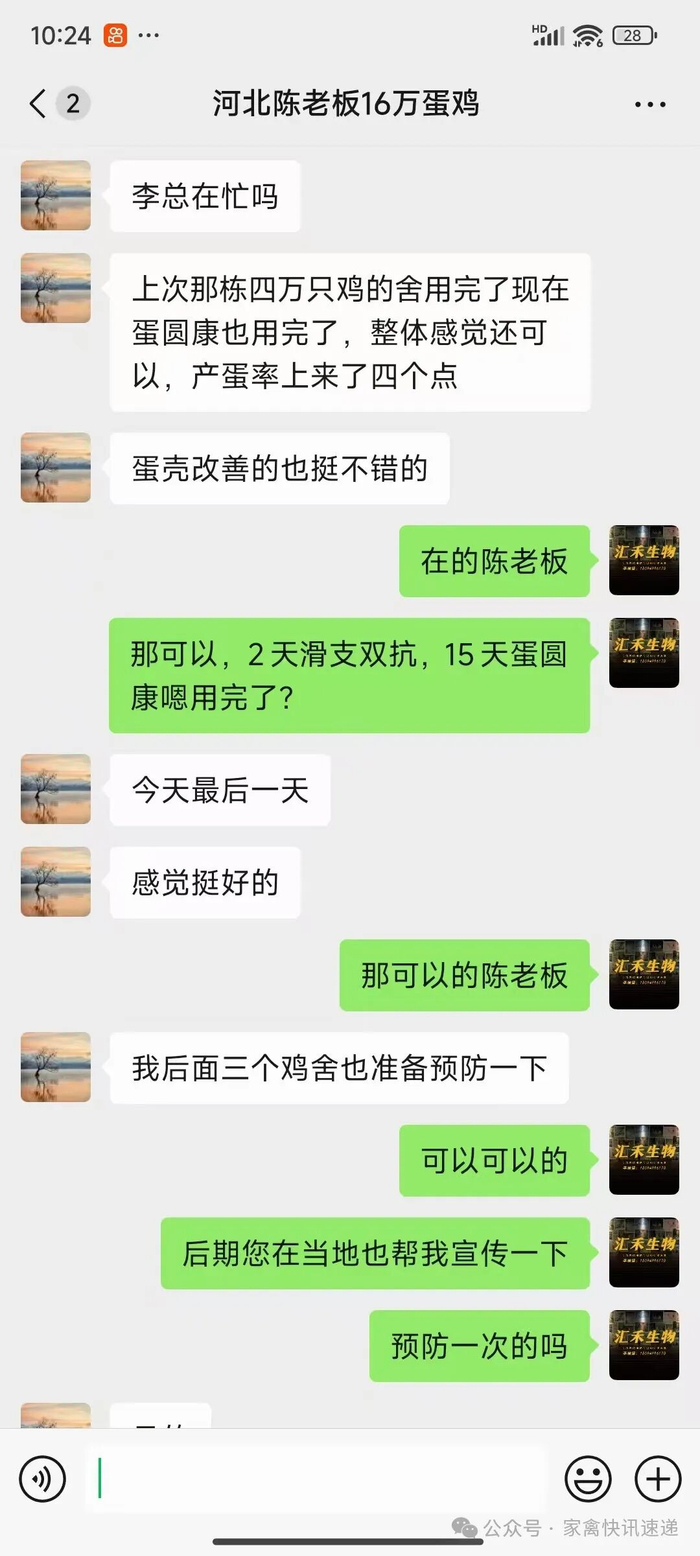 陈老板四万羽蛋鸡总计用了80瓶滑支双抗195包蛋圆康,在用完之后也是第一时间联系了李老师。说明了使用情况,产蛋率恢复了四个点左右,产蛋品质也是改善了非常多。像软皮蛋、沙壳、破壳蛋明显减少了。并且又把鸡场剩余的三栋鸡舍又增加预防一次使用效果也是非常好。