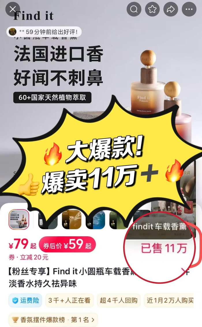 至于价格,Find it小圆瓶车载香某音在售79元,券后都要59元/瓶!(爆卖十几万单!!)