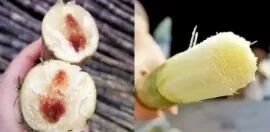 切开后瓤部的色泽比正常甘蔗深,一般呈浅棕色,蔗心发红或发灰,甚至有时还能看到毛茸茸的菌丝。