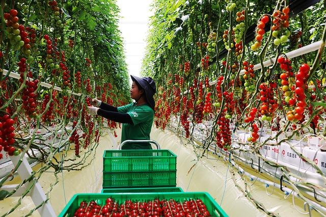 2026年3月28日,山东省东营市利津县凤凰城街道凯盛浩丰(利津)现代智慧农业示范园内,一串串青红交错的樱桃番茄缀满枝头,农户们正忙碌着采摘成熟的樱桃番茄发往订单市场。张敏摄