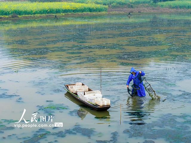 2026年3月30日,安徽省铜陵市枞阳县藕山镇,养殖户正在捕捞小龙虾。刘伯顺摄(人民图片网)