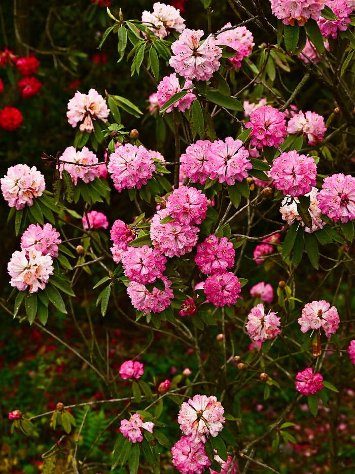 群山为台,云雾为幕,数十种野生杜鹃次第开放,从绯红到素白,从深紫到明黄,一山不同色,一树不同花。