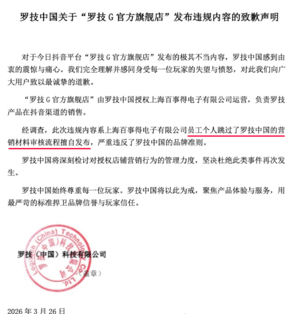 3月26日深夜,微博账号@罗技中国 发布声明,就不当视频内容致歉。