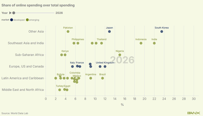 “到2036年,新兴市场将新增超过10亿消费者,推动全球消费者规模增长32%。相比之下,发达经济体仅新增2800万消费者。”全球支付平台EBANX近日发布的《Beyond Borders 2026》报告(下称“报告”)显示,新兴市场的年轻人群正在主导未来10年的数字消费。
