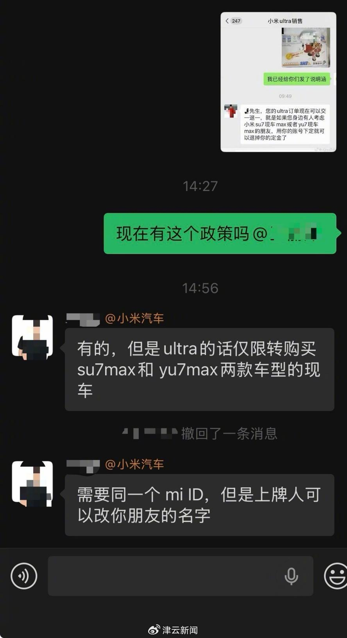 上海车主林盛告诉津云记者,得知“交一退一”的政策之后,他也第一时间向销售人员求证,对方确认后解释,“但是Ultra的话仅限转购买SU7 Max和YU7 Max两款车型的现车,需要同一个mi ID,但是上牌人可以改你朋友的名字。”