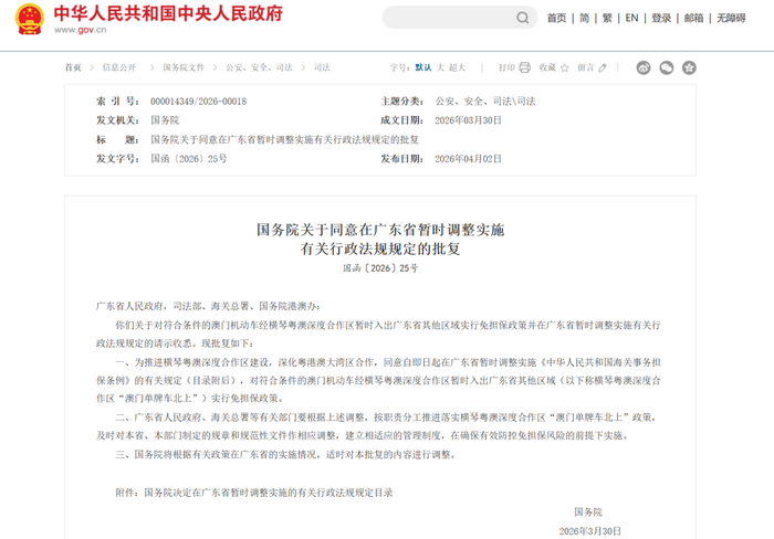 4月2日,中国政府网发布《国务院关于同意在广东省暂时调整实施有关行政法规规定的批复》,同意自即日起在广东省暂时调整实施《中华人民共和国海关事务担保条例》的有关规定,对符合条件的澳门机动车经横琴粤澳深度合作区暂时入出广东省其他区域实行免担保政策。这意味着横琴“澳门单牌车北上”政策实施取得重要进展。