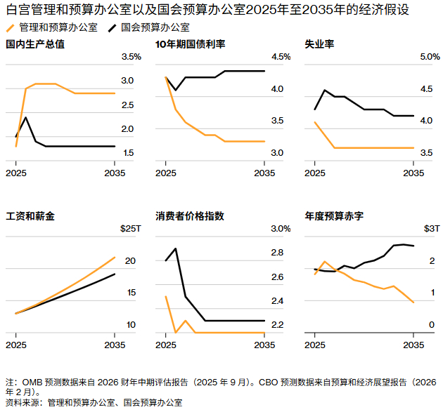 白宫的经济预测历来都比较乐观。正因如此,国会才在同一部规范总统年度预算案的法律中设立了无党派的国会预算办公室(CBO)。CBO预测2026年GDP增长率为2.2%。尽管如此,美国国债的买家仍将密切关注白宫如何看待这些关键指标。