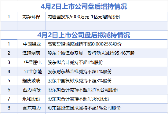 4月2日增减持汇总:中国铝业等8家公司拟减持 龙净环保增持(表)