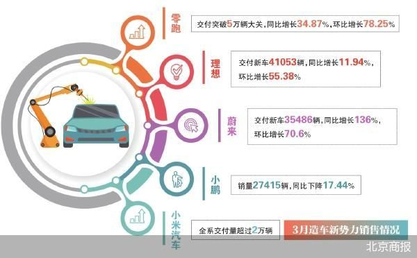4月1日起,造车新势力陆续发布3月交付数据,头部车企重回3万辆月销大关,在传统淡季后行业整体实现销量回暖。其中,零跑继续领跑,交付量破5万辆,理想、蔚来月销量分别突破4万辆和3万辆,小鹏和小米则位居2万辆的销量区间,行业呈现分化态势。