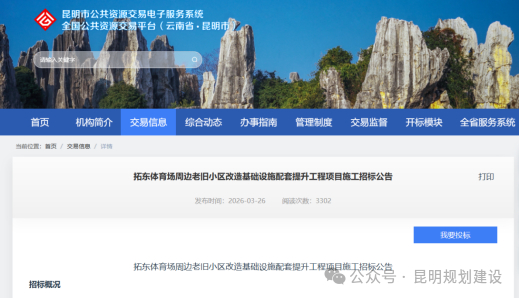 3月26日,云南省公共资源交易信息网发布《拓东体育场周边老旧小区改造基础设施配套提升工程项目施工招标公告》,该项目聚焦拓东体育场周边片区,从建筑风貌、交通路网到公共空间,进行系统性提升改造。