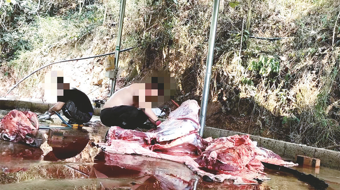 3月30日上午,记者沿该洗车场旁的小路进山约100米,在山林边缘隐蔽处找到了这个仍在运营的屠宰点。这里距离安之吉市场约10公里,现场绑有生牛,旁边停放着货车和电动三轮车。