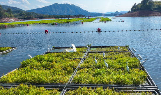 4月1日,浙江淳安,千岛湖镇坪山水域,成群的白鹭在“湖上菜园”里觅食、嬉戏,成为一道亮丽的生态风景线。