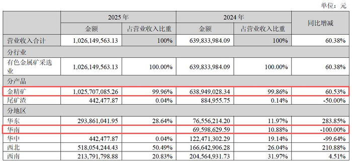 分地区来看,四川黄金2025年在华南地区的营收为零(上年为6959.86万元);华东地区营收达2.94亿元,同比增长283.85%;西北地区营收达5.18亿元,同比增长210.88%。