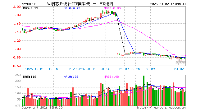 4月2日,科创芯片设计ETF国联安(588780)跌2.77%,成交额8801.65万元。当日份额增加2400.00万份,最新份额为10.88亿份,近20个交易日份额增加2000.00万份。最新资产净值计算值为8.37亿元。