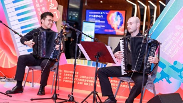 手风琴演奏家封景锐是第一次在机场演出。“舞台的物理空间很小,但有一种面向全球听众的感觉。”他曾在国外的交通枢纽听过音乐人的演奏:“一下子提升了对城市的第一印象,有品位更有温度。”为了这场“国际演出”,他与列夫·索罗莫诺维奇对二重奏《江南好》稍加设计,“最后一分钟的‘斗琴’是这首曲子的高潮,我想这对于听众尤其是爱好音乐的听众来说,是很有吸引力的”。