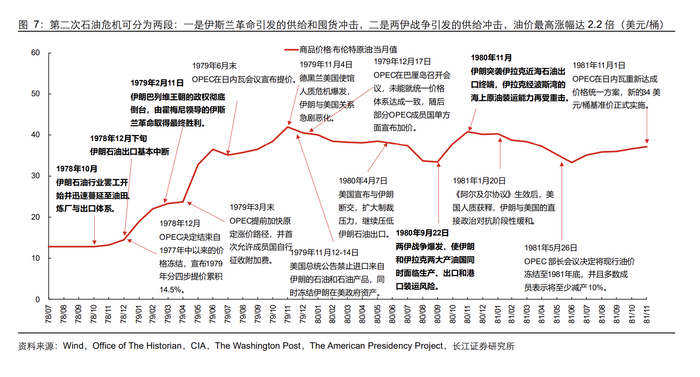报告写第一次石油危机有个容易被忽略的细节:石油危机不是美国通胀的起点。1973年10月前,美国通胀已在上行,背后是宽松货币与财政扩张带来的需求过热,叠加布雷顿森林体系解体、食品价格上涨、价格管制放开等供给与制度因素;禁运更像“放大器”,把原有通胀压力推向更难收拾的区间。对应的政策路径也不是一脚油门一脚刹车:先放缓紧缩、禁运缓解后重新收紧、衰退加深再转向宽松。