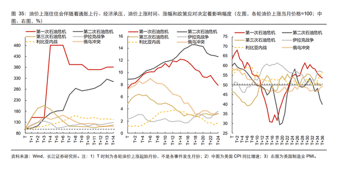 时间维度上,报告给了几条可以直接拿来对照的经验刻度:供给冲击通常1—3个月左右见底,油价通常2—4个月左右见顶;油价在3—6个月左右见顶的几轮(第三次石油危机、伊拉克战争、俄乌冲突),美国通胀也往往在3—6个月左右见顶;油价见顶超过6个月且高位横盘的几轮(第一次、第二次石油危机以及利比亚内战),通胀见顶会拖到12—18个月。制造业PMI的见底更“看政策脸色”:当油价冲高时间短且货币政策偏宽松稳经济时,PMI大约5—6个月见底;当油价上涨时间长或政策偏紧时,PMI见底会拉长到16—20个月。