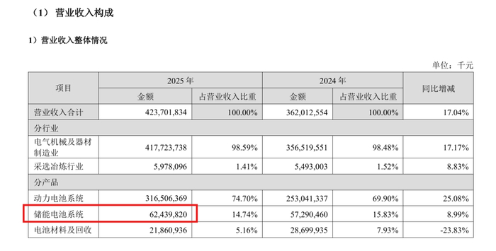 其中,储能电池系统2025年营收624.40亿元,营收规模同比增加8.99%,占总营收14.74%。