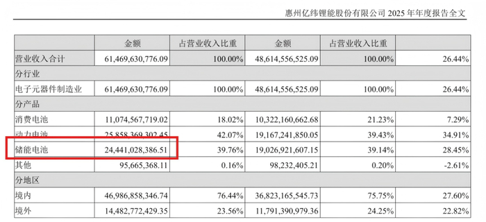 其中,储能电池2025年营收244.41亿元,营收规模同比增加28.45%,占总营收39.76%。