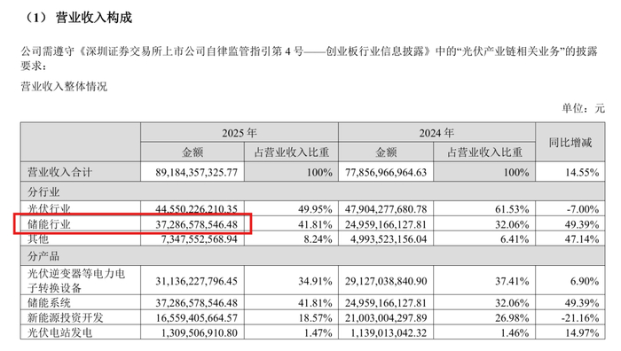 其中,储能系统2025年营收372.87亿元,营收规模同比增加49.39%,占总营收41.81%。