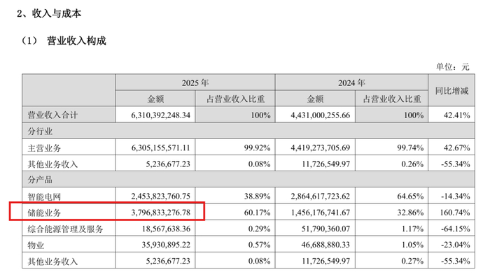 其中,储能业务2025年营收37.97亿元,营收规模同比增加160.74%,占总营收60.17%。