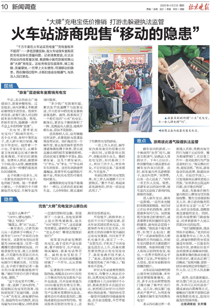 “千万不要在火车站买充电宝”“充电宝根本不能用”……多名旅客反映,在火车站候车室购买的充电宝存在质量问题。北京晚报记者调查发现,在北京西站站内候车室区域,有游商小贩向旅客兜售山寨“大牌”充电宝。这些充电宝包装简单、做工粗糙、质量堪忧,一旦带上火车使用,可谓移动的隐患。而在推销过程中,小贩们也会互相通气,与执法人员打游击。