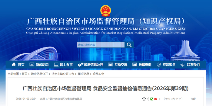 广西壮族自治区市场监督管理局食品安全监督抽检信息通告(2026年第39期)