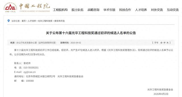 4月2日,中国工程院发布《关于公布第十六届光华工程科技奖通过初评的候选人名单的公告》。