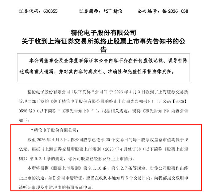 4月3日晚,*ST精伦公告,公司于当日收到上海证券交易所管理二部下发的《关于精伦电子股份有限公司的终止上市事先告知书》,截至4月3日,因公司股票已连续20个交易日收盘总市值均低于5亿元,已经触及终止上市情形。