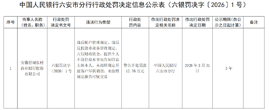 4月3日金融一线消息,据中国人民银行六安市分行行政处罚决定信息公示表显示,安徽舒城农村商业银行股份有限公司因违反账户管理规定、违反反假货币业务管理规定、占压财政资金、提供个人不良信息未事先告知信息主体本人、未按照规定开展客户尽职调查、未按照规定报告可疑交易,被警告并处罚款12.76万元。