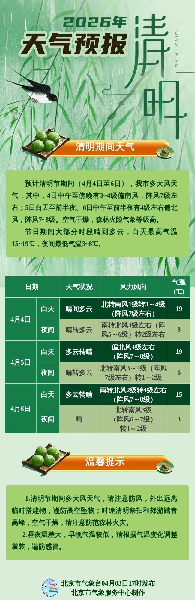 另据气象北京消息,预计清明节期间(4月4日至6日),本市多大风天气,其中,4日中午至傍晚有3至4级偏南风,阵风7级左右;5日白天至前半夜、6日中午至前半夜有4级左右偏北风,阵风7至8级。空气干燥,森林火险气象等级高。