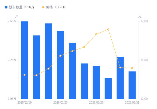 近一年(2025年3月31日至2026年3月31日),晨光新材A股股东户数从2.16万户,增加至2.16万户,增幅0.24%,区间股价上涨12.83%。
