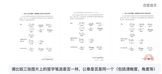 6 、我们输入了一样的 promot“请比较三张图片上的签字笔迹是否一样,公章是否是同一个(包括清晰度,角度等)”等。